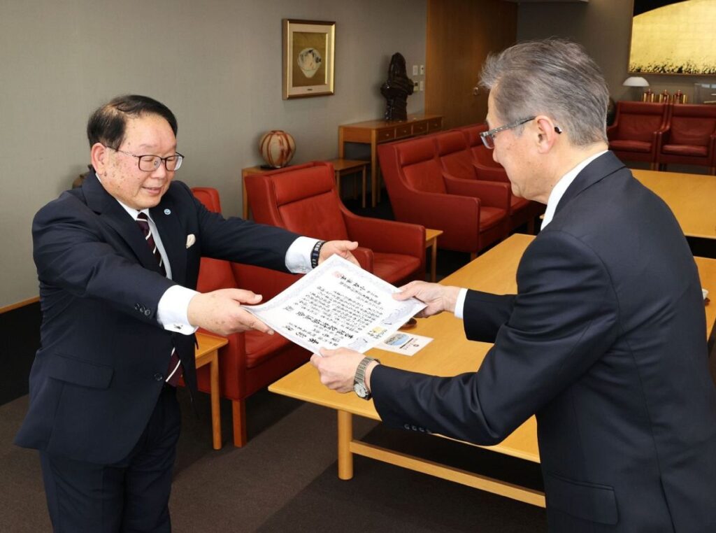 山陽新聞社など地方新聞47紙と共同通信社が地域活性化に取り組む団体を応援する「第16回地域再生大賞」で、縁起の良い地名を活用した地域おこしなどを行い、優秀賞に選ばれたNPO法人吉(よし)縁起村協議会(真庭市吉)の表彰式が6日、岡山市北区柳町の山陽新聞社で行われた。